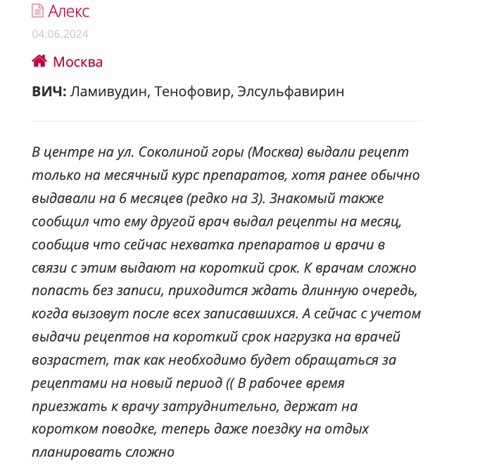 "В центре на ул. Соколиной горы (Москва) выдали рецепт только на месячный курс препаратов, хотя ранее обычно выдавали на 6 месяцев (редко на 3). Знакомый также сообщил, что ему другой врач выдал рецепты на месяц, сообщив что сейчас нехватка препаратов и врачи в связи с этим выдают на короткий срок. К врачам сложно попасть без записи, приходится ждать длинную очередь, когда вызовут после всех записавшихся. А сейчас с учетом выдачи рецептов на короткий срок нагрузка на врачей возрастет, так как необходимо будет обращаться за рецептами на новый период. В рабочее время приезжать к врачу затруднительно, держат на коротком поводке, теперь даже поездку на отдых планировать сложно."