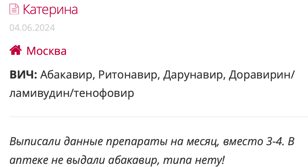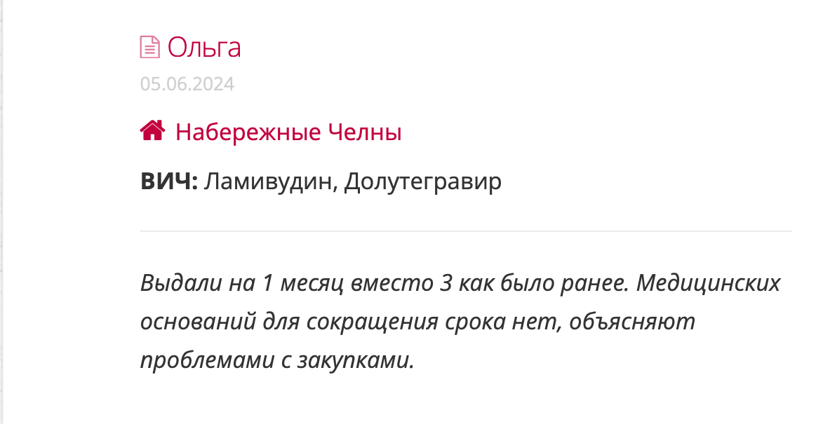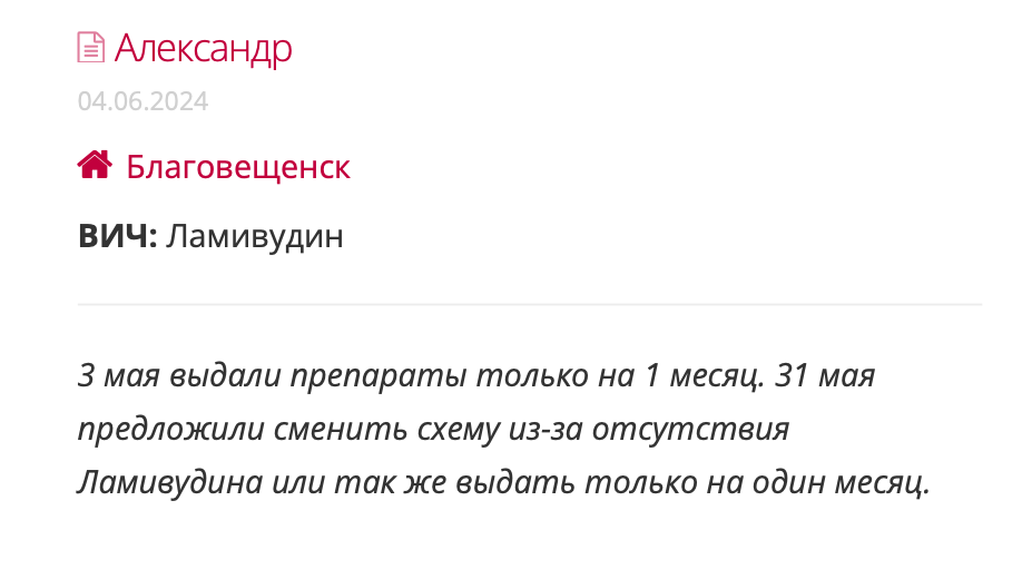"3 мая выдали препараты только на 1 месяц. 31 мая предложили сменить схему из-за отсутствия Ламивудина или так же выдать только на один месяц."