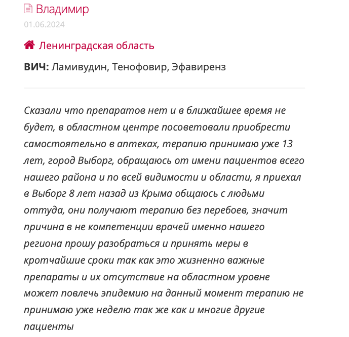 "Сказали что препаратов нет и в ближайшее время не будет, в областном центре посоветовали приобрести самостоятельно в аптеках, терапию принимаю уже 13 лет, город Выборг, обращаюсь от имени пациентов всего нашего района и по всей видимости и области. Я приехал в Выборг 8 лет назад из Крыма, общаюсь с людьми оттуда, они получают терапию без перебоев, значит причина в не компетенции врачей именно нашего региона. Прошу разобраться и принять меры в кратчайшие сроки, так как это жизненно важные препараты и их отсутствие на областном уровне может повлечь эпидемию. На данный момент терапию не принимаю уже неделю, так же как и многие другие пациенты."