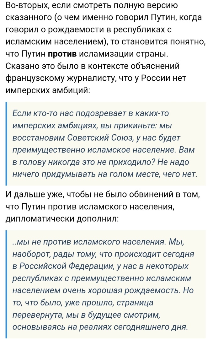 "Мы не против прироста исламского населения, мы наоборот рады тому, что происходит сейчас в Российской Федерации. У нас в некоторых наших республиках, преимущественно с исламским населением, очень хорошая рождаемость, мы очень рады", - заявил Путин на встрече с представителями СМИ.