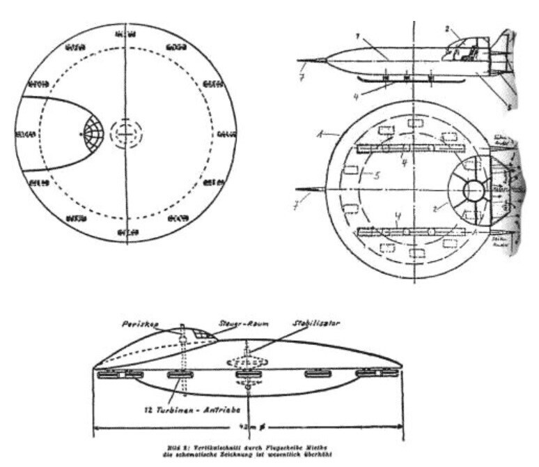 Этот проект «тарелки», возможно, был результатом исследований конструкции фузеляжа летательного аппарата в форме «летающее крыло». Он был начат в 1942 году и находился под руководством доктора Ричарда Мите, иногда называемого доктором Генрихом Рихардом Мите. До войны о докторе Мите мало что известно. По слухам, после войны доктор Мите работал над проектом англо-американской «тарелки» в канадской фирме Avro Aircraft Limited. Так утверждают Кляйн, Эпп, Бартон, Лусар, а также множество других источников. К проектам Avro вернемся позже...