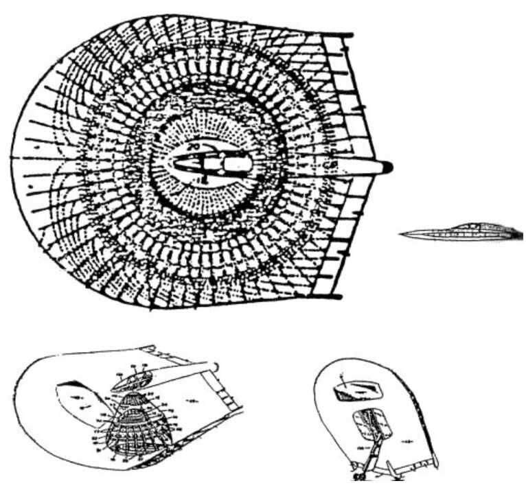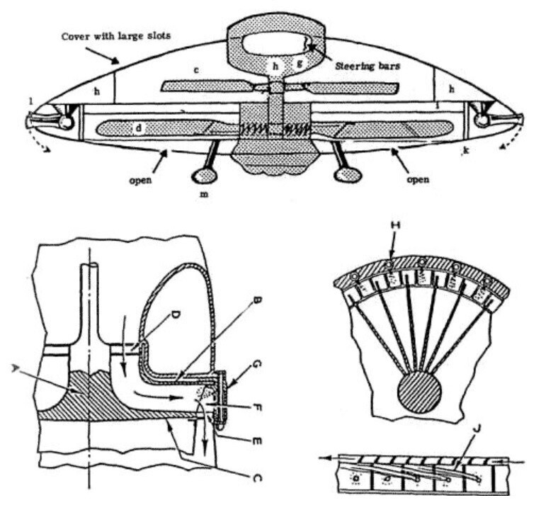 На первый взгляд кажется, что это двухтактная винтовая система, приводимая в движение одним двигателем. Нет. Двенадцать форсунок также не лишены опоры, как изображено. Настоящий ответ на эту загадку заключается в том, что этот рисунок неполный. При изображении готовых деталей мог бы появиться радиальный турбореактивный двигатель особого типа. Первый вариант отличается от третьего в том, что последний с его центрально расположенной кабиной и симметричным расположением двенадцати регулируемых форсунок управляется путем выборочного отключения различных форсунок с помощью окружающего кольца. Это позволяет диску делать повороты и взлетать вертикально.