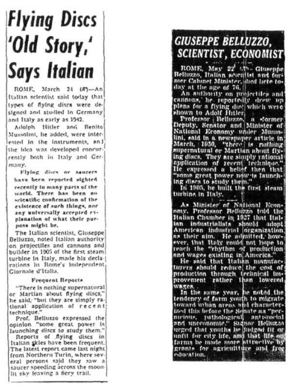 После войны Беллуццо, кажется, вел спокойную жизнь в Италии до своей смерти 22. 05. 52. Однако, в отличие от Мите, Беллуццо оставил записи о немецких летающих дисках после войны. Его цитируют по этой теме в The Mirror, крупной газете Лос-Анджелеса в 1950 году. Возможно это первое упоминание о немецких «тарелках» в американской прессе. В некрологе в New York Times упоминается его работа над программой «Немецкое блюдце».