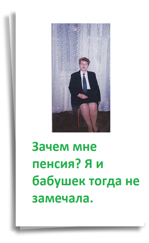 Однако, надо радоваться тому, что пенсионеры умудряются работать за маленькие зарплаты на малопрестижных рабочих местах. Иначе, эти места были бы заняты молодыми людьми, которым нужно и семью содержать, и квартиры покупать…