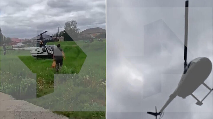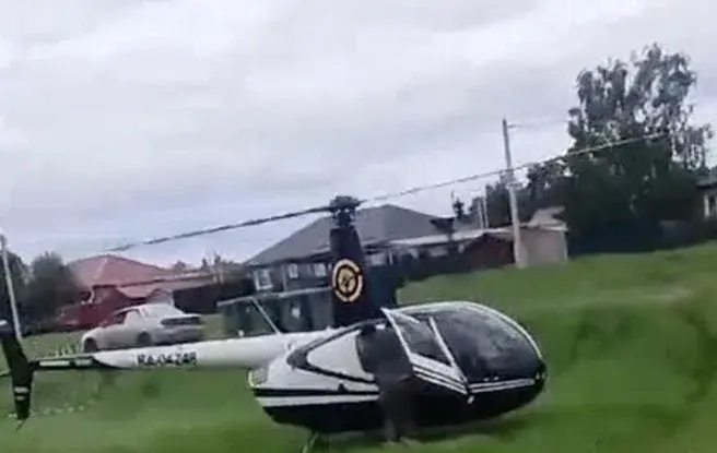 Вертолет сел прямо между частными домами. Изумленные от увиденного школьники сняли на видео мужчину, который вышел из магазина с пакетом, после чего сел в кабинку вертолета и улетел. Кто этот человек, который выбрал такое своеобразное «такси» до магазина — неизвестно