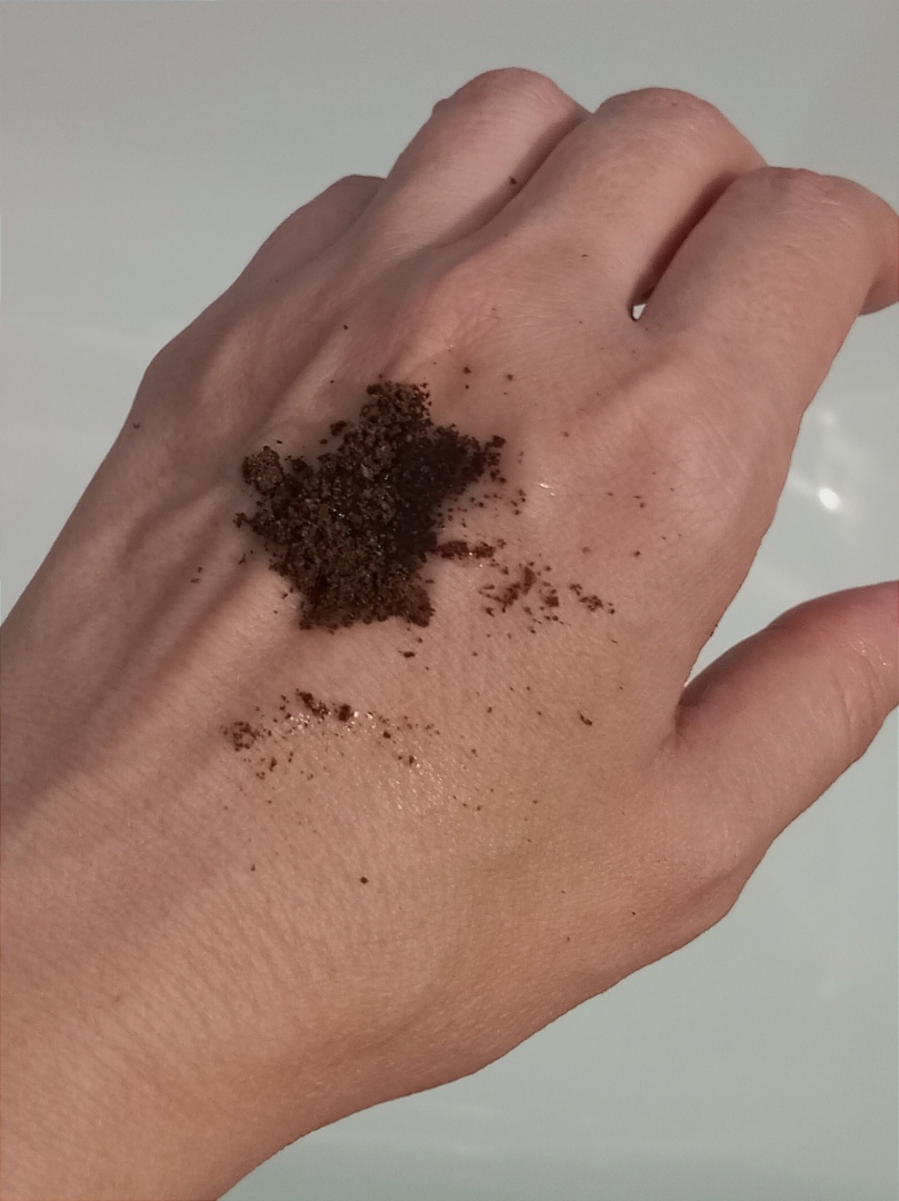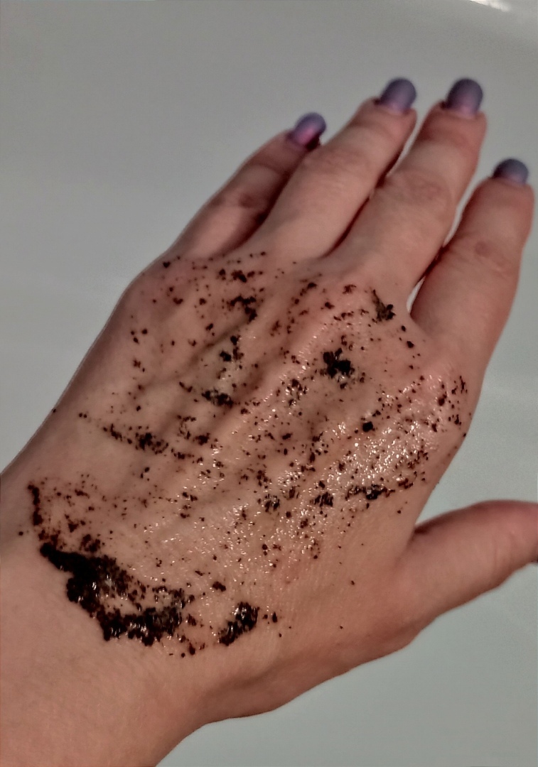 Итак, всё просто - я беру на порцию немного геля и щепотку сухого спитого кофе. Наношу всё это на влажную кожу и начинаю растирать. Благодаря гелю (можно брать и жидкое мыло) кофейная гуща хорошо скользит по коже, прекрасно очищая и полируя её.