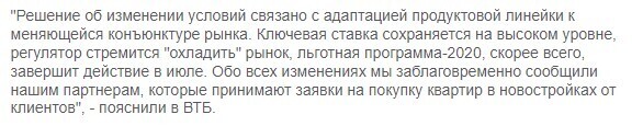В ВТБ свое решение объяснили меняющейся конъюнктурой рынка. "Ключевая ставка сохраняется на высоком уровне, регулятор стремится "охладить" рынок, льготная программа-2020, скорее всего, завершит действие в июле", - говорится в сообщении.