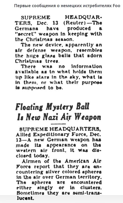 Во-первых, они говорят или подразумевают, что обе стороны во Второй мировой войне считали foo fighters оружием, принадлежащим противоположной стороне. В качестве источника они могут сослаться на какого-то немецкого летчика, явно «не в курсе», который утверждает, что немцы не знали их происхождения.