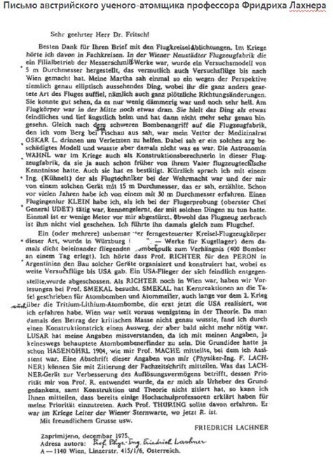 Один или несколько беспилотных и дистанционно управляемых подобных летающих объектов типа «волчок» упоминаются Лахнером в связи с массированными бомбардировками союзников на шарикоподшипниковом заводе в Вюрцбурге. Наконец, Лахнер писал, что профессор Рихтер построил эти устройства для Peron в Аргентине. На самом деле, при испытательном полете на дальние расстояния один такой объект был сбит и доставлен в Соединенные Штаты. Остальная часть письма касается ядерных разработок в Австрии и США до и после Второй мировой войны.
