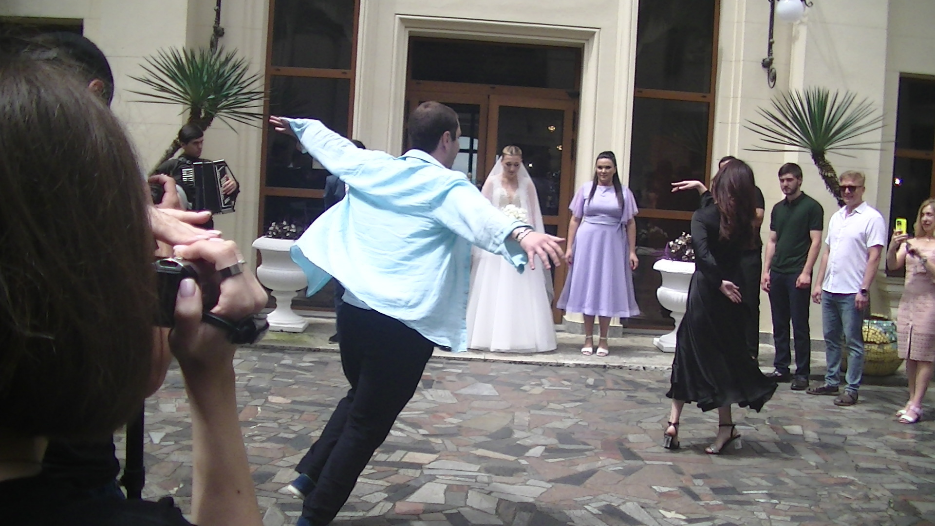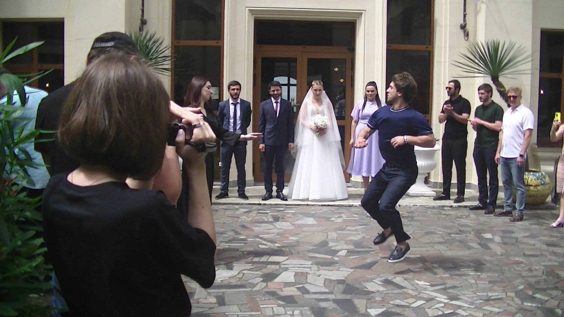 Церемония встречи молодых под задорные кавказские оглушительные танцы оказалась поистине грандиозным событием, которое надолго запомнится нам. Этот момент отразил в себе не только танцевальное мастерство, но и искренние чувства и эмоции, которые наполняли воздух этого прекрасного места.