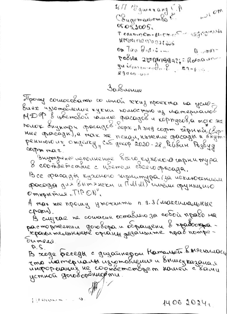 Озвученная стоимость была 165.000 руб кухня должна была быть сделана из материала МДФ ( о чём обсуждалось в устном диалоге)
