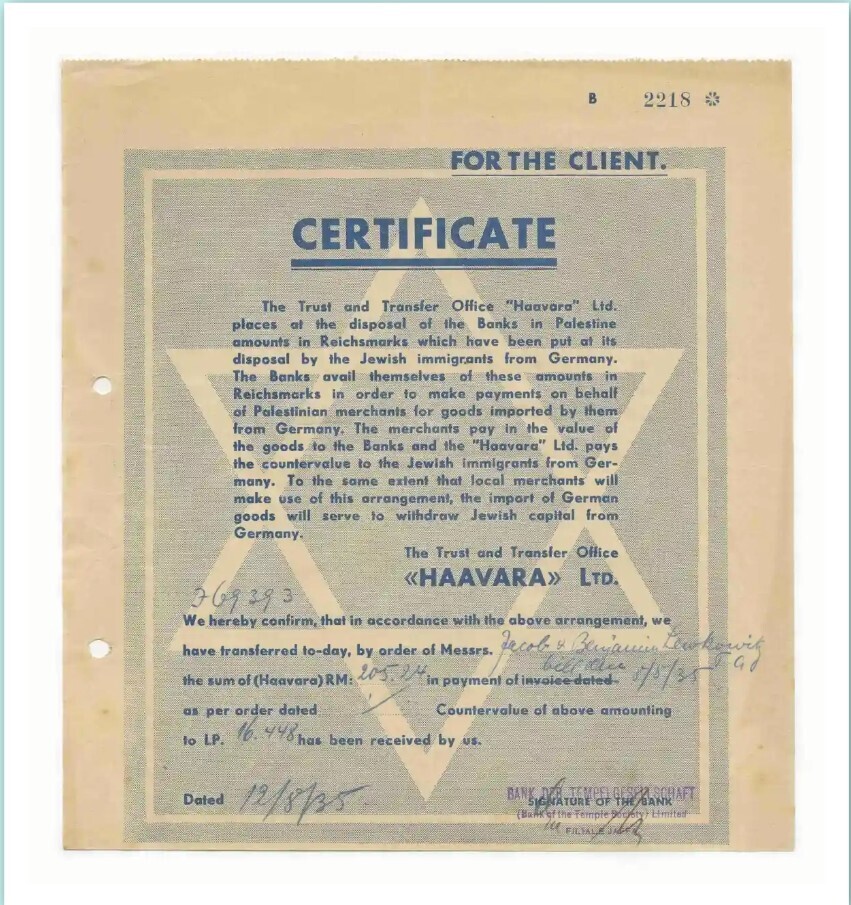 Доверительное и трансфертное управление, HAAVARA, LTD." (Пример сертификата, выданного Хааварой евреям, эмигрировавшим в Палестину)