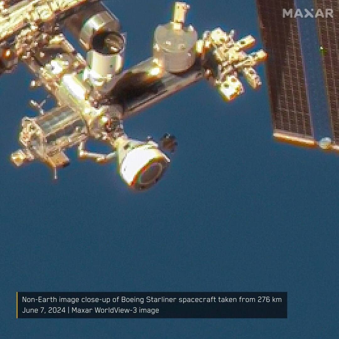 Спутник компании Maxar Technologies 7 июня сделал фотографию МКС, отдельно выделив космический корабль Starliner. В момент съёмки спутник находился в 276 километрах от станции.
