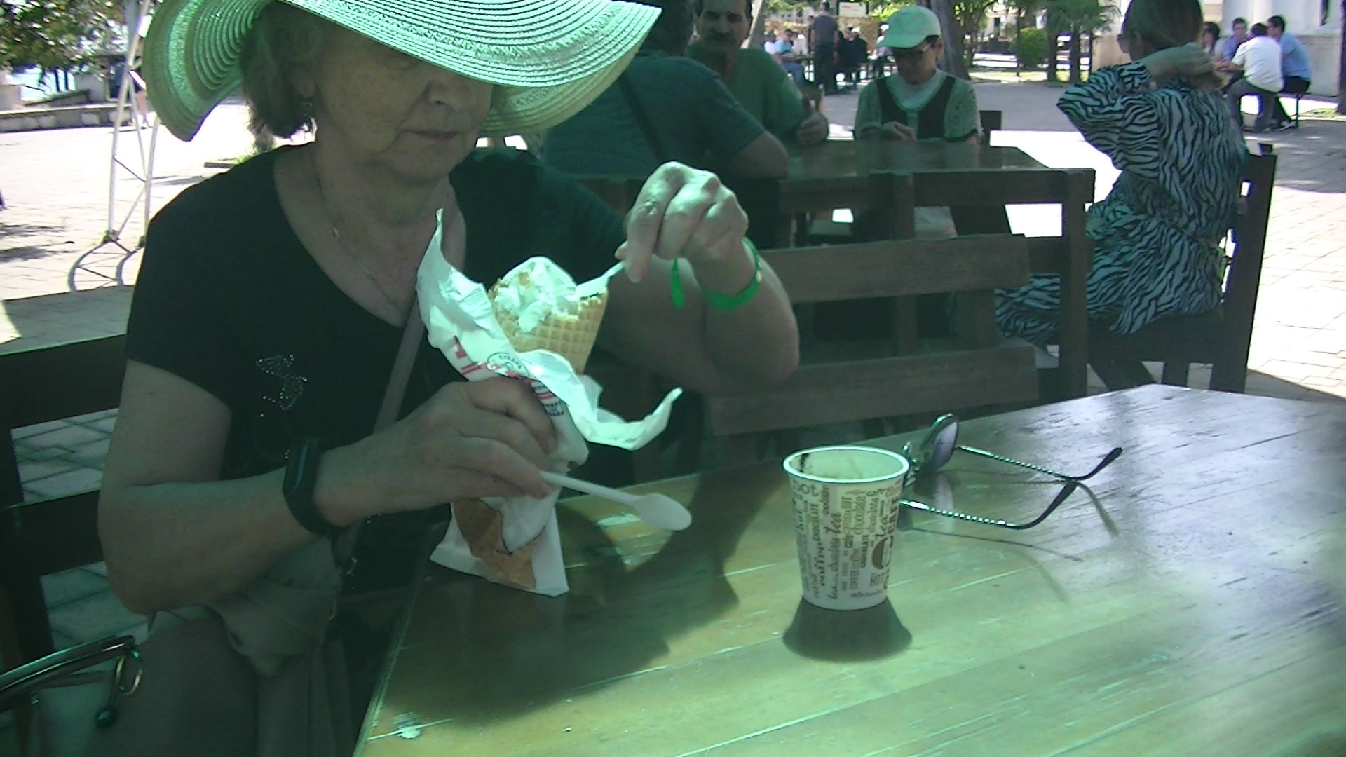 Нас это сильно заинтриговало и мы решили проверить что же за кофе они пили. Сели за столик, заодно жена купили рожок мороженого.