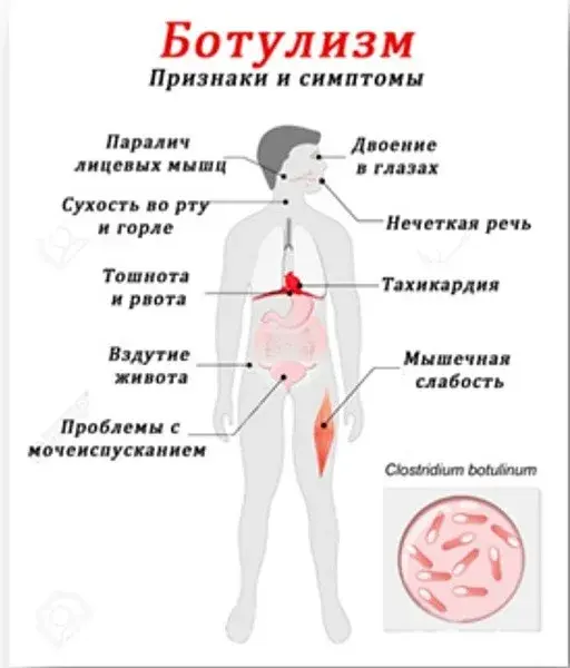 Симптомы ботулизма могут проявляться через 12-36 часов после заражения и включают: