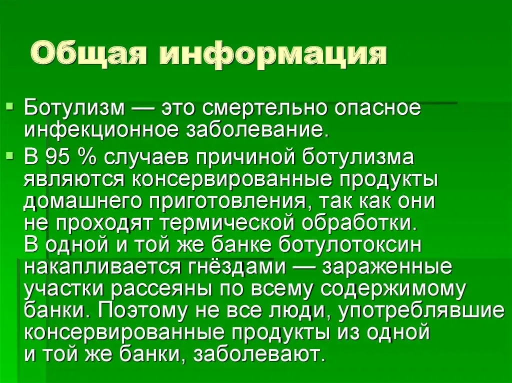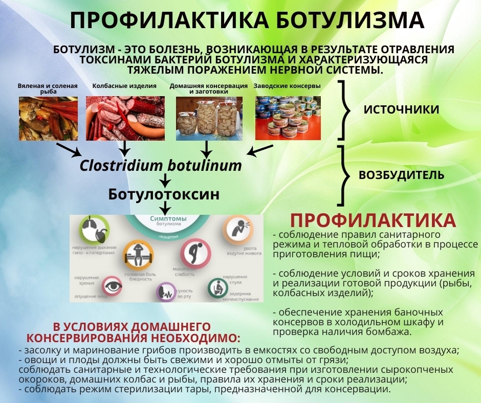 Основные причины ботулизма связаны с употреблением в пищу продуктов, содержащих ботулотоксины. Это могут быть: