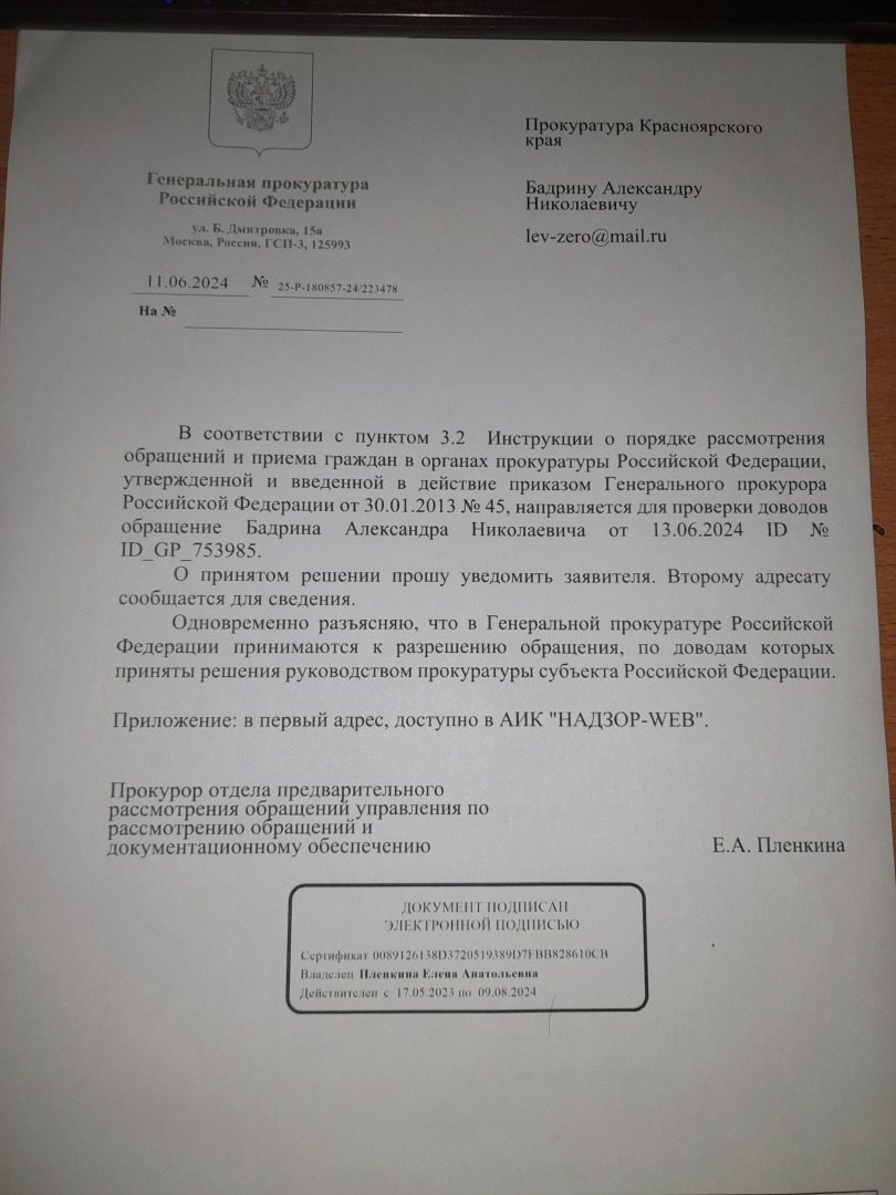 Процессуальному беспределу удивляться уже не приходится - 17.06.2024 года в прокуратуру Красноярского края направлен отвод прокуратуре Красноярского края на участие в судебном заседании 13.06.2024 года." ОПЕРАТИВНОСТЬ " ЗАСЛУЖИВАЕТ "УВАЖЕНИЯ" !!!