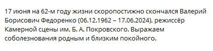 Режиссер Камерной сцены имени Б. А. Покровского Большого театра Валерий Федоренко скоропостижно скончался на 62-м году жизни.