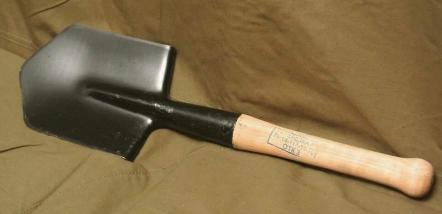 Одна лопата – саперская. Ямку выкопать для костра, например. А вторая лопатка – совковая (железная на деревянной ручке, небольшая). Это помощница. Закопались колеса в песке, нужно откапываться. Тут в ход и саперская и совковая.