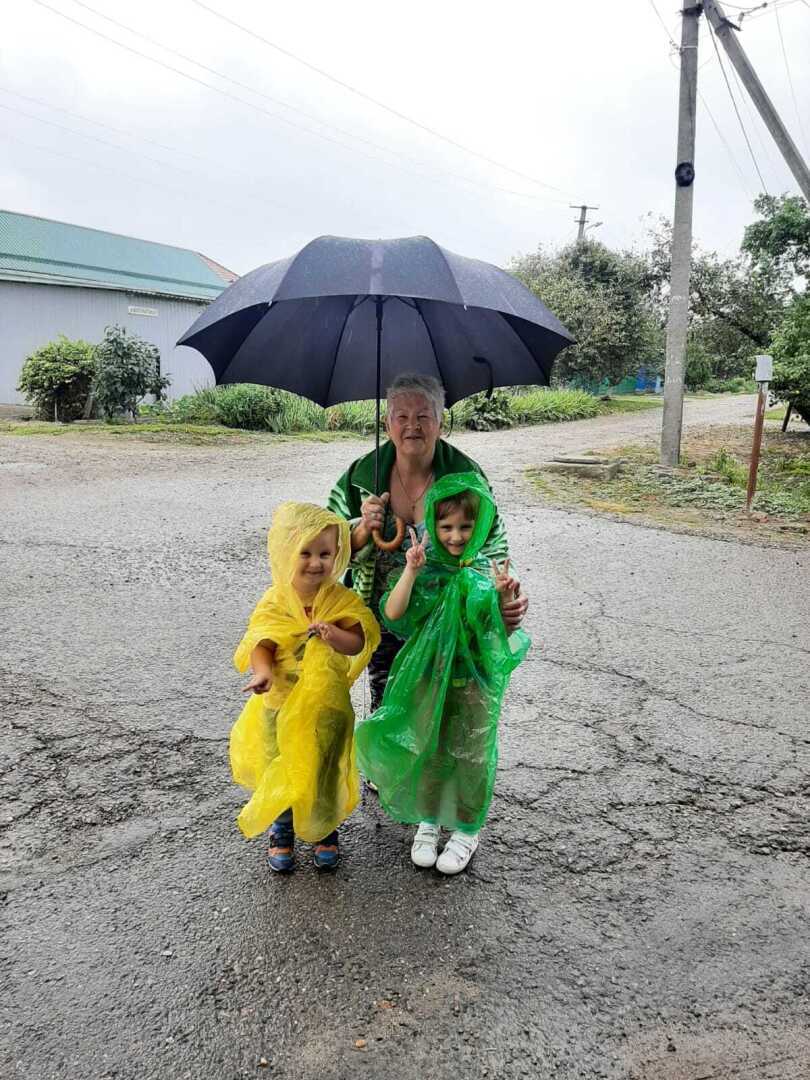Вдруг дождь – у меня зонт! Правда есть еще и плащ-дождевик. Новенький. Лежит в кармашке. А раньше было два дождевика, но приехав к внукам, отдала им. Накрапывал дождик, и мы пошли гулять. Я и моя мама под зонтиком, а они в дождевиках. Красота.