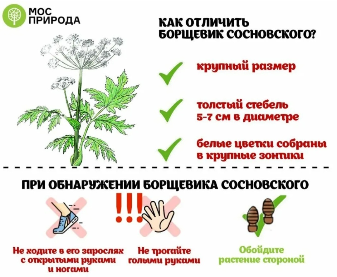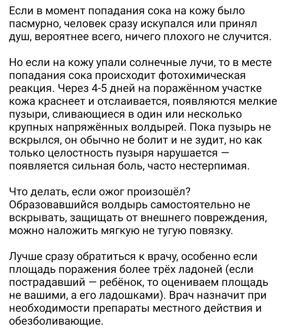 Сразу после попадания на кожу ничего. Сок у борщевика прозрачный, он быстро сохнет, покраснений и жжения нет. Но это обманная реакция растения, сок ядовит и вызывает сильнейшие ожоги, поэтому, если вы имели контакт с борщевиком, примите срочно меры: