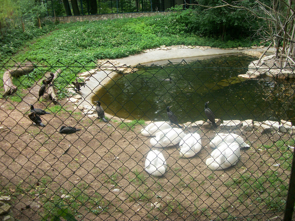 В одном из вольеров находились вместе белоснежные пеликаны и ещё какие-то птички, которые питаются рыбой.