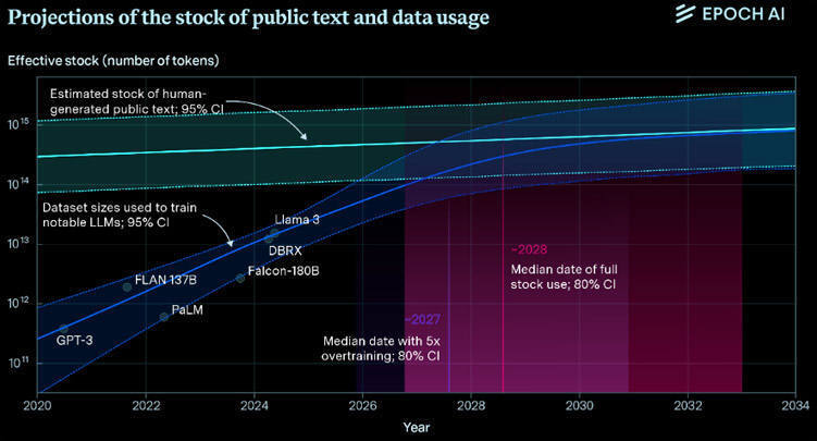 Модели искусственного интеллекта, такие как GPT-4 или Claude 3 Opus, полагаются на триллионы слов, которыми делятся в Интернете, чтобы стать умнее, но новые прогнозы предполагают, что они исчерпают запас общедоступных данных в период с 2026 по 2032 год.