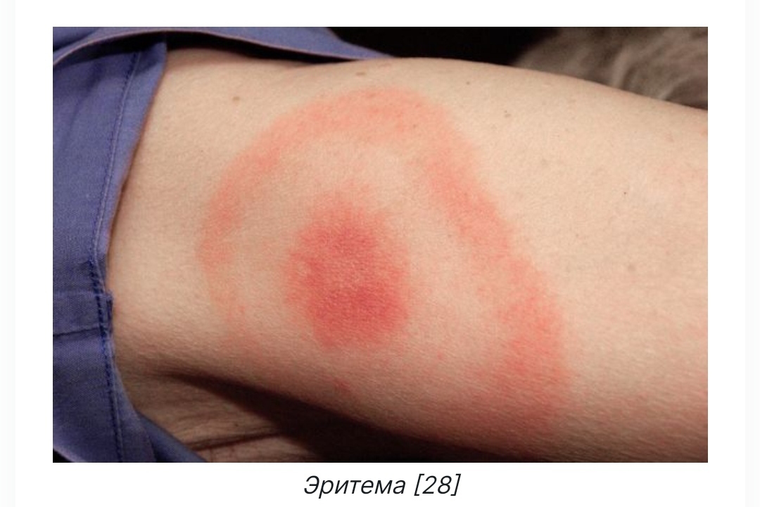 Борролиоз имеет три стадии развития осложнений: 1 стадия - до 2 недель, интоксикация с повышением температуры до 38 °C, в области укуса наблюдается воспаление лимфоузлов, часто появляется эритема, широкая область кожного покраснения (см.картинку);
