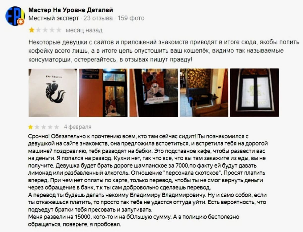 Чашечка кофе – 500 рублей, бокал шампанского – 8000, средний чек – 30 000 рублей. Рекорд по разводке лоха – 380 000 рублей!