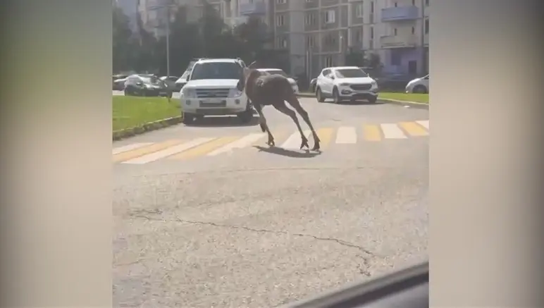 Животное случайно вышло в город и явно впало в состояние паники. Бегает по проезжей ...