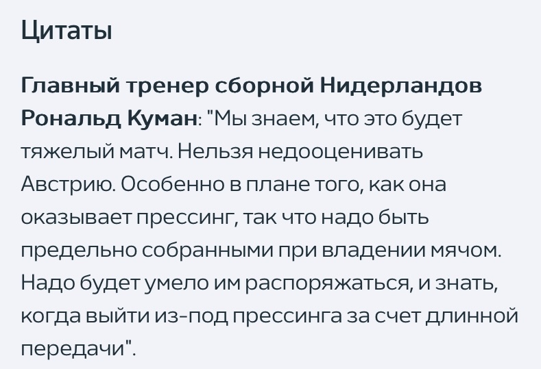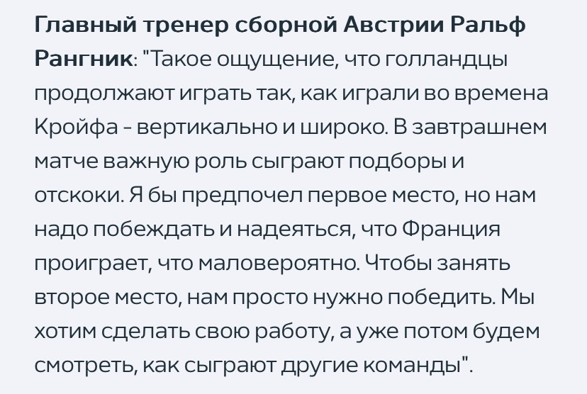 В матче Нидерланды - Австрия заложена огромная интрига, так как каждая из команд имеют возможность быть лидерами в случае победы над соперником. Тренеры обеих команд называют эту встречу заранее тяжелой и у каждого надежда на победу.