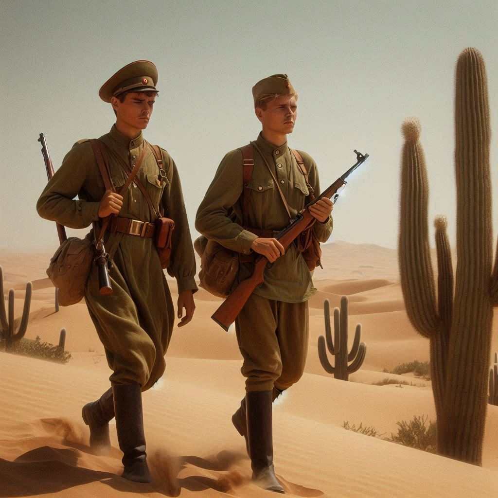 В пустыне, где земля казалась бесконечной и безжалостной, двое солдат оказались с ней один на один. В пустыне шли учения. Васенев и Гаврилов, молодые и не очень опытные, были назначены регулировщиками. Васеневв был назначен старшим регулировщиком. Они попали в ловушку, созданную неожиданной песчаной бурей. Они были застигнуты врасплох этой стихией. С каждым часом, проходящим в этом безлюдном месте, они начинали понимать друг друга глубже. Васенев, строгий и решительный, стал открываться перед Гавриловым, рассказывая о своих страхах и надеждах. Гаврилов же, более легкомысленный и шутливый, находил способы поднять настроение своему товарищу. Пришла ночь. Их никто не искал. Гаврилов уговорил Васенева, что надо выбираться самим. Ночью, когда звезды засверкали над ними, Васенев и Гаврилов решили определить направление. Они взяли направление по Луне и стали следовать за ней. Но, Гаврилов ошибся и спутал юг с севером. Эта ошибка привела их к новому уголку пустыни, где они не нашли причин для радости. Путь обратно увеличился на 45 км. Это было трудное испытание для обоих солдат. Тем более, что их искали. Они видели летающий, в районе учений, вертолет. Днём они копали в горячем песке ямки для укрытия от солнца. Песок был такой горячий, что он почти казался расплавленным. Они использовали все свои силы, чтобы вырыть достаточно глубокие ямки, чтобы поместиться там безопасно. Когда ямки были готовы, они укрылись под плащпалатками, которые у них были с собой. Это было единственным способом защититься от жары и солнца. Потом многое пришлось выбросить. Автоматы АК-Васенев, как старший, выбрасывать запретил. Но, не все было спокойно между Васеневым и Гавриловым. В один жаркий день они оба стали испытывать жажду. Вода была очень ценна в этих условиях. Гаврилов неожиданно набросился на Васенева за последнюю каплю воды. Ссора началась быстро и стала очень серьезной. Оба солдата были готовы на всё ради этого важного ресурса. Однако, сил продолжать потасовку не было. Дальнейший путь продолжался ночью-ползком. Оба солдата сильно похудели и высохли. Вода к ночи кончилась. На рассвете Васенев решил ползти дальше. Гаврилов лежал неподвижно. Васенев полз медленно. К счастью, после очередного движения Васенев кубарем полетел в арык с водой. Границей между пустыней и полем хлопчатника-был арык. Вдоволь накупавшись, Васенев быстро набрал воды в сапоги. Не теряя времени, пошел к Гаврилову, Вода оживила их, и они почувствовали себя лучше, чем когда-либо. По дороге в часть Васенев рассказал Гаврилову о своем приключении и о том, как он нашел спасение в самом неожиданном месте. Их дружба только укрепилась после этого приключения, и они оба поняли, что иногда самое неожиданное может принести наибольшую радость.