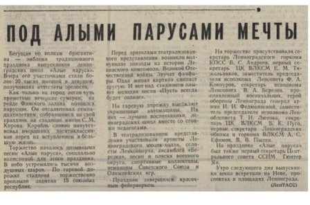 Идея праздника ленинградцам понравилась, так как «Алые паруса» символизируют надежду на светлое будущее, а главное – исполнение мечты, которая свойственна молодым и юным.