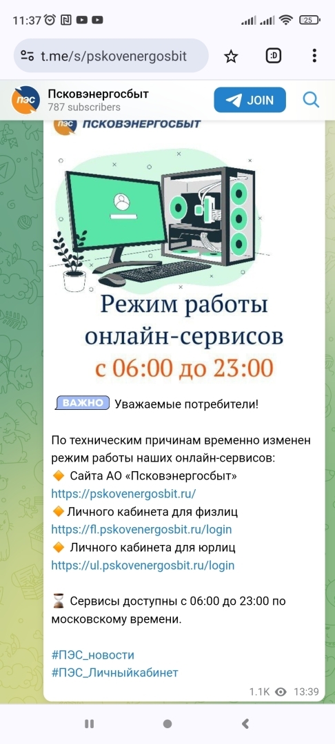 Немного не о том , вчера я думала , что столкнулась с проблемой интернета. Но быстро разобралась , что это сайт не работает. Вчера я вспомнила в двенадцатом часу ночи , что не подала данные по электрическому счётчику ( у нас это возложено на абонентов, хоть счётчик находится в подъезде ) зашла как обычно по ссылке сайт недоступен и с домашнего провайдера и с Теле 2. Ладно пытаюсь зайти с личного кабинет с сайта, та же история. Вбиваю в поисковик запрос и нахожу телеграмм канал Псков Энергосбыта , где написано , что у них приём показаний с 23 часов до 6 часов на интернет ресурсах не осуществляется.