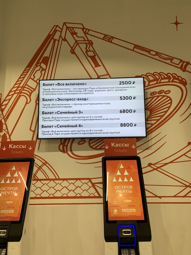 Цена билетов не бюджетная, но зато можно кататься на всех аттракционах без ограничений.Мы были в будний день, в выходные, скорее всего, дороже.
