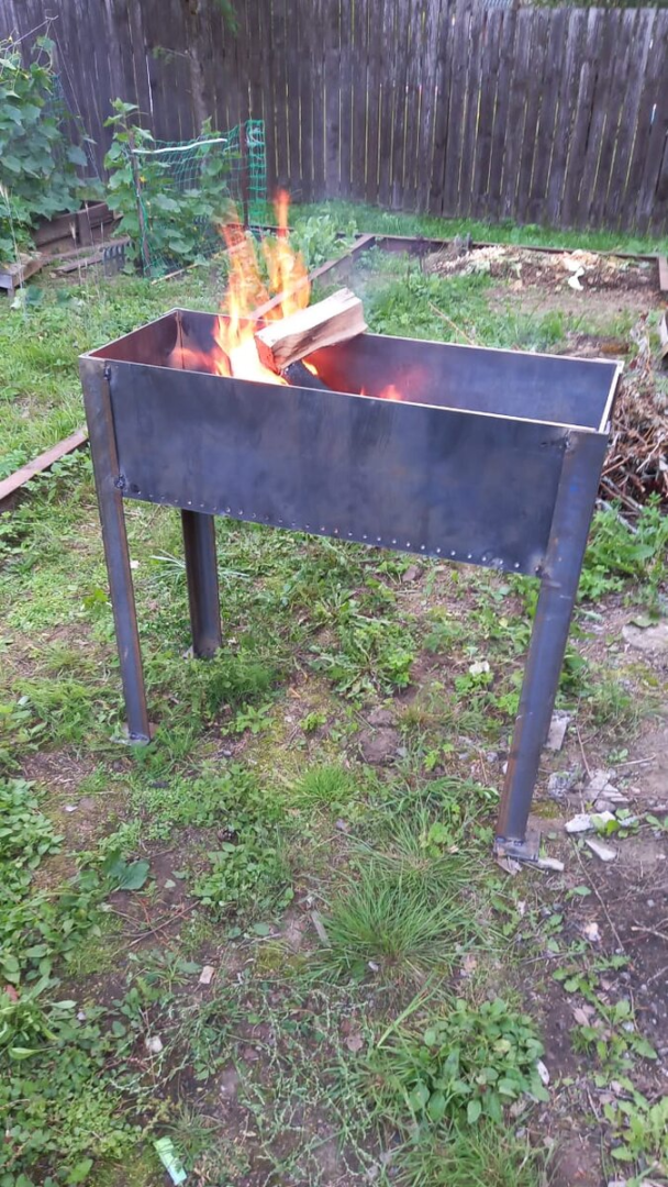 Мангал. Высота жарки 10-15 см справедлива для тех одноразовых жестянок, что продают в магазинах. Я в этом году сделал сам мангал из сантиметрового железа. Он прекрасно накапливает температуру и отдаёт ее, когда угли ещё прогорают. Высоту я сделал 30 см, планирую сделать ступенчатые прорези, чтобы регулировать высоту, но прекрасно работает и так. Причём, если пламя вспыхивает, то оно просто не достаёт.