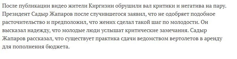 В Кыргызстане разразился громкий скандал, после того как племянница президента страны Садыра Жапарова стала героиней вирусного видео. На этих кадрах Айзада Нуркожоева вместе со своим избранником прилетает на вертолете МЧС в живописное ущелье, где ей делают эффектное предложение руки и сердца. Видео вызвало бурную реакцию в обществе, многие сочли произошедшее неуместным проявлением роскоши и злоупотреблением служебным положением.