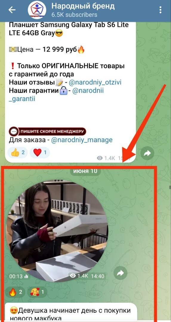 Далее, канал «Народный бренд» утверждает, что упакованные товары передает в доставку через СДЭК, закрепляя видео-сообщением, которое видно всем пользователям. «Вот ваши посылки, не переживайте, все придет, трек-номера вам вышлем, мы – честнее некуда», - сообщение в их видео-отзыве. Также встречаем здесь и видео-отзыв довольной девушки - клиентки, получившей в СДЭКе свой новенький Макбук.