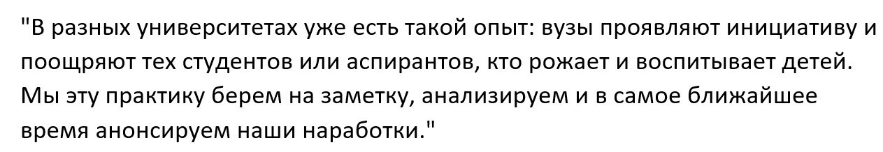 Стоит отметить, что уже сейчас во многих вузах России существуют различные формы поддержки студентов-родителей. Например, по данным Минобрнауки, в 452 университетах страны выплачивается материальная помощь женщинам, которые стали матерями во время обучения, а в 347 вузах оказывается поддержка одиноким матерям или отцам.