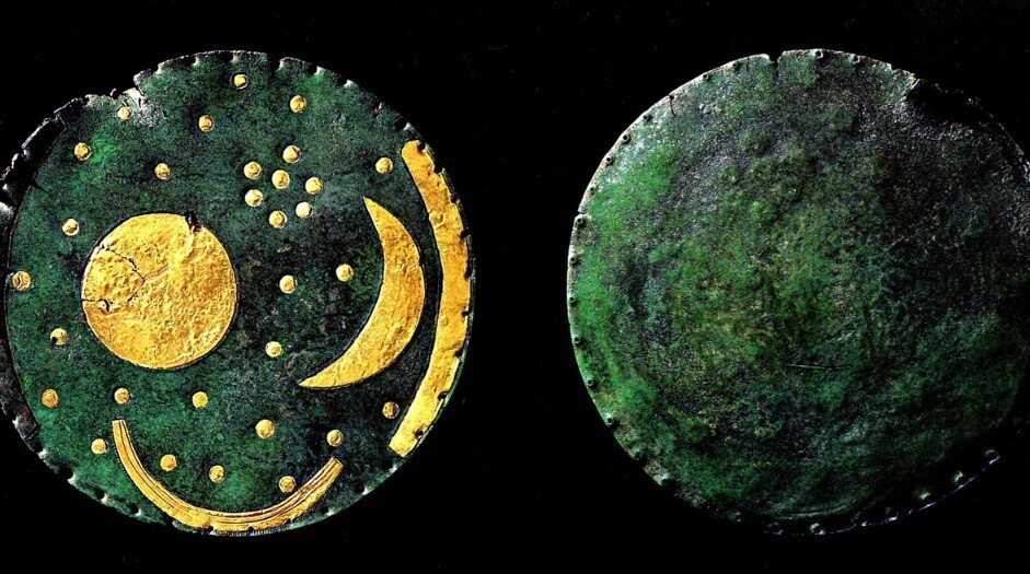 Это бронзовый диск диаметром около 32 сантиметров с выгравированной на нем золотой схемой небесного свода. На нем изображены солнце, луна, Плеяды и три других полумесяца, два из которых предположительно являются линиями горизонта, а другой — возможной «Солнечной баржей» внизу.