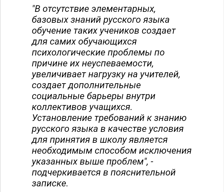 Во-вторых, этот законопроект игнорирует тот факт, что многие родители мигрантов не владеют русским языком достаточно хорошо, чтобы самим помочь своим детям адаптироваться к школьной программе.