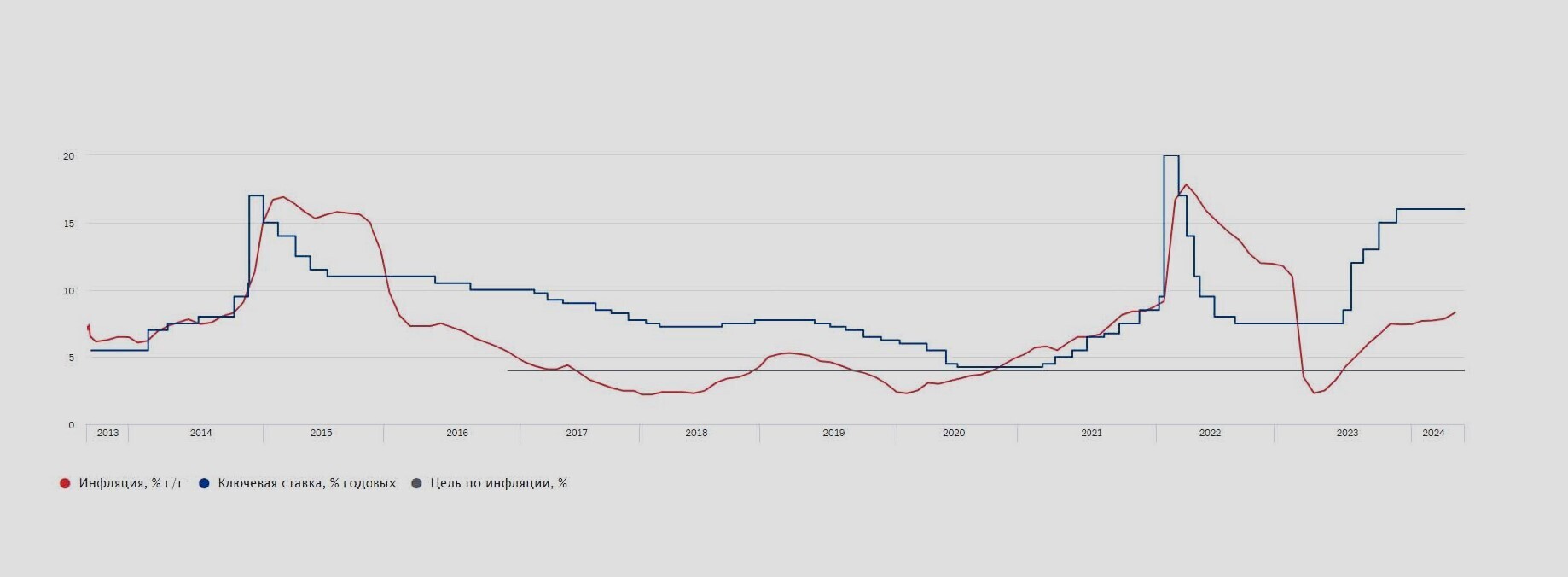 Вопрос в другом, насколько высоко надо поднимать ключевую ставку. В нашей стране эта ставка держится с декабря 2023 года на уровне 16%. Ключевую ставку устанавливает Совет директоров Банка России на своих заседаниях. Последнее решение - 16%. Следующее заседание в июле месяце и уже есть прогнозы, что ключевую ставку ещё повысят.