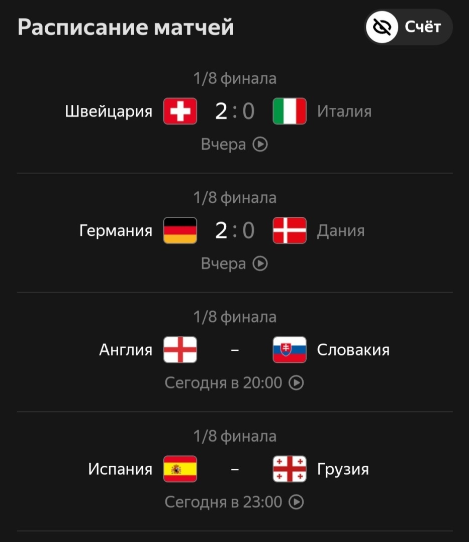 Спорт. Футбол. Чемпионат Европы 2024. Стадия плей-офф. 1/8 финала. Матчи прошедшие в субботу, и которые состоятся в воскресенье
