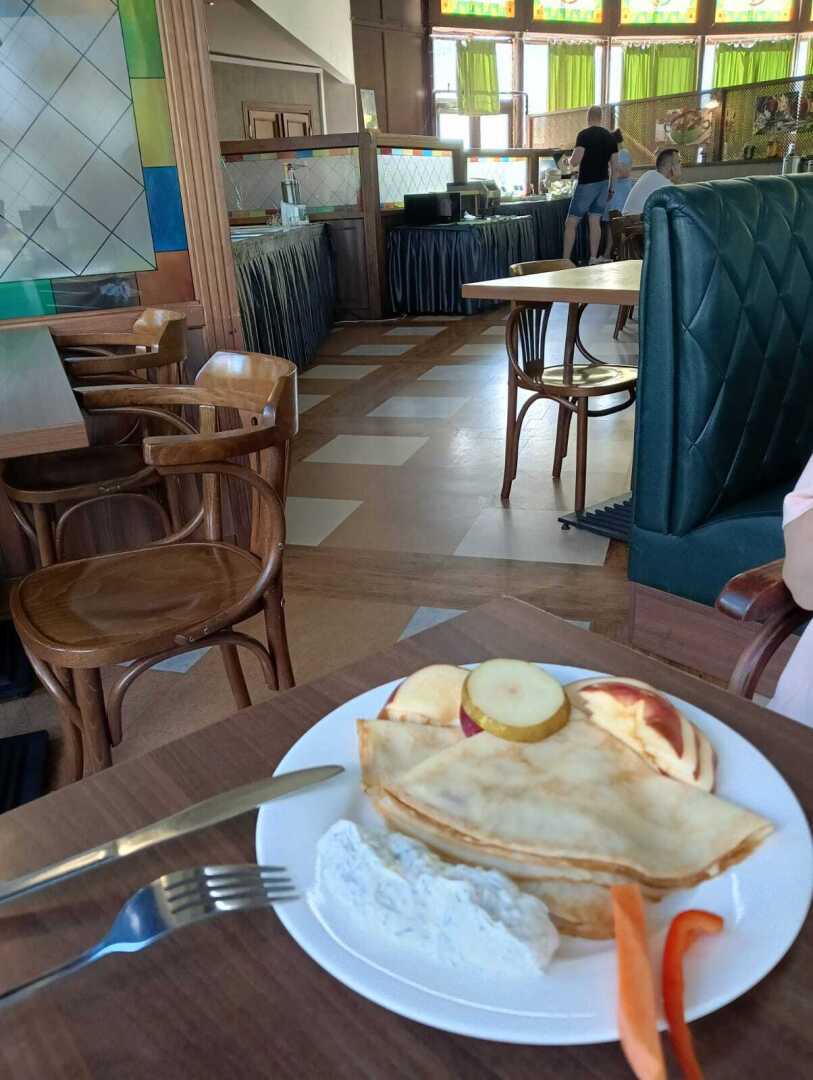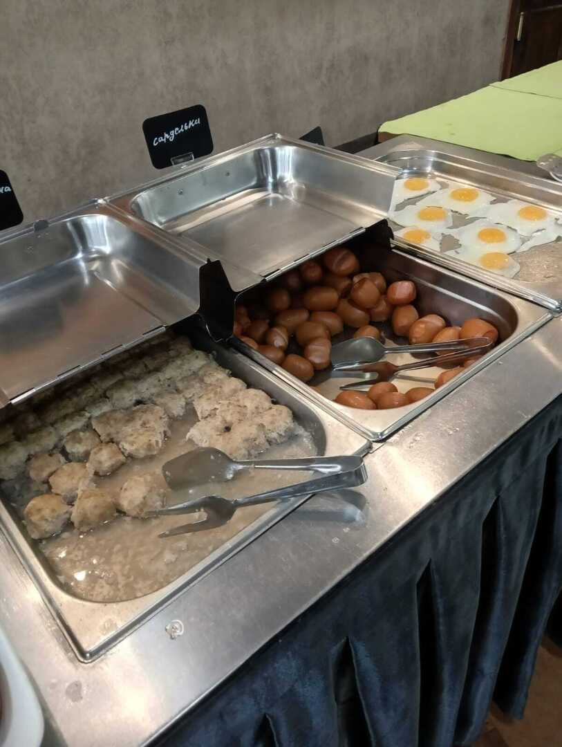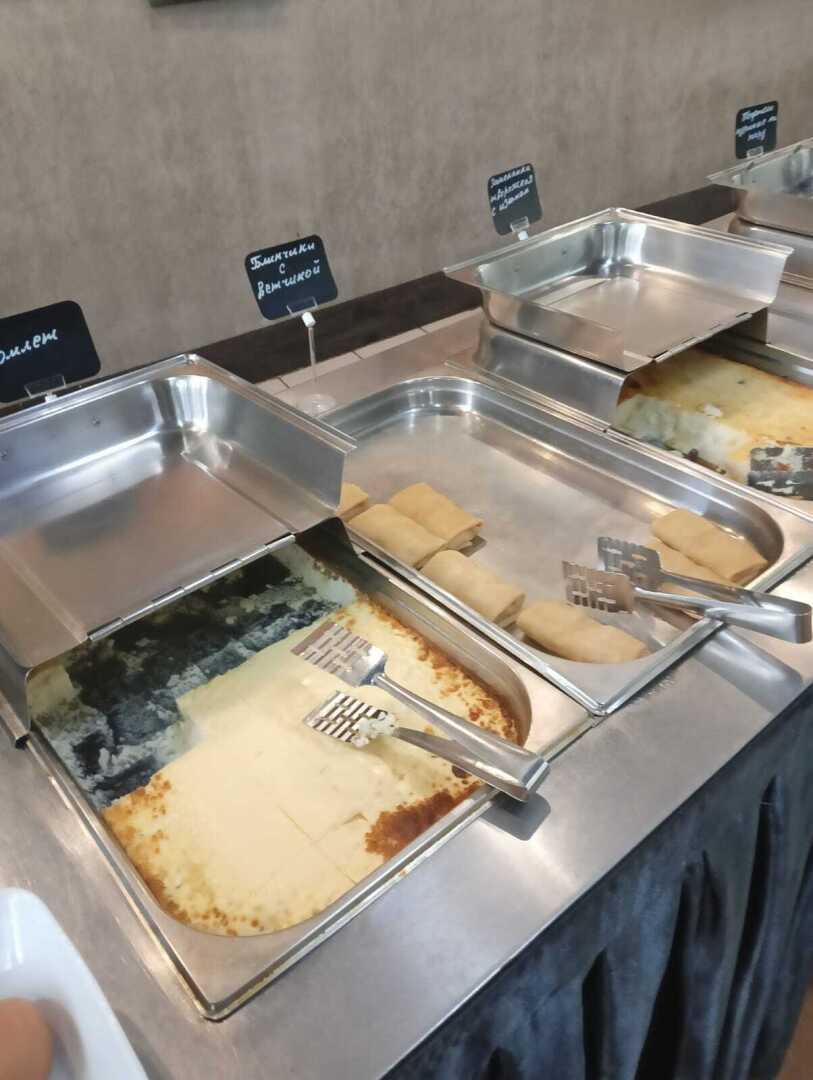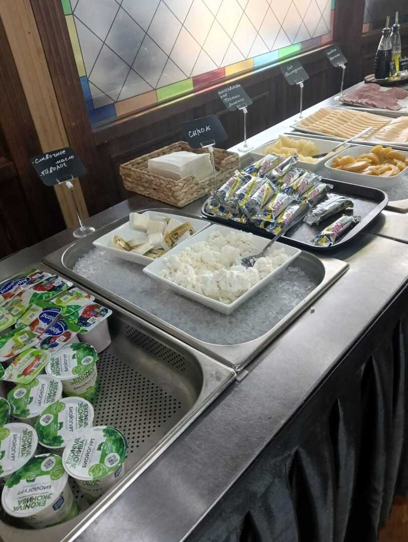 На завтрак очень много молочных продуктов: молочные каши, запеканки, блинчики с начинками и без, пудинги, а также порционные упаковки творожков, йогуртов...