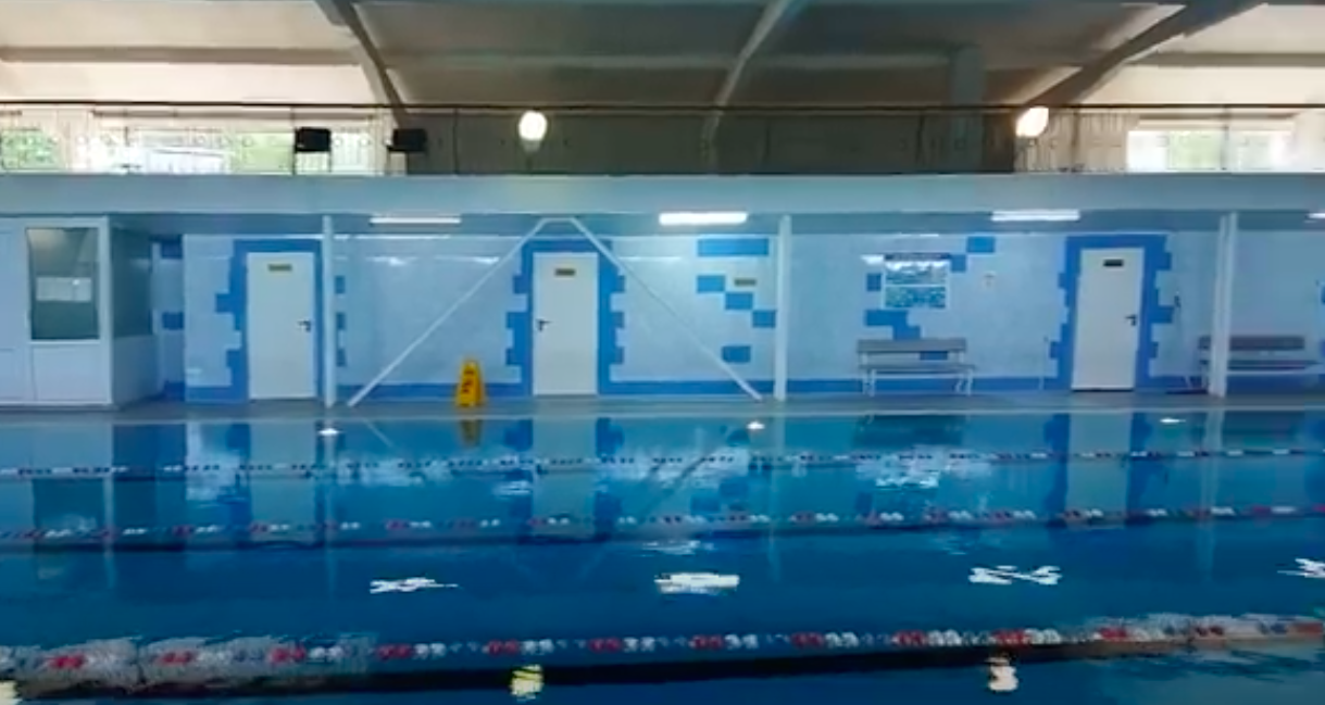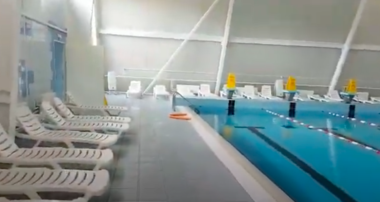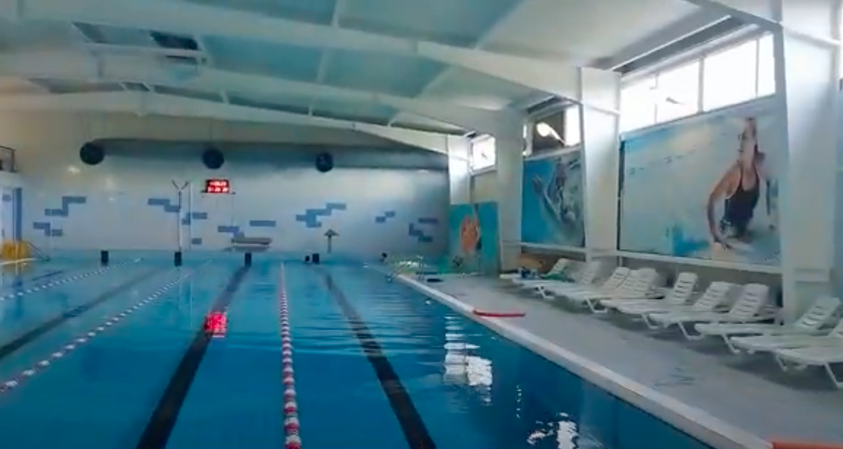 На втором этаже спорткомплекса расположен большой бассейн с четырьмя дорожками по 25 метров длиной.