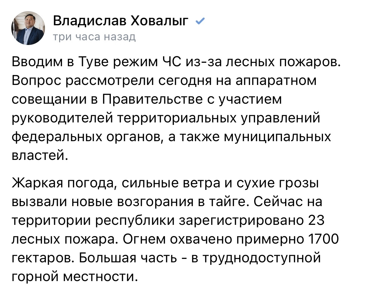 Ситуация в Туве продолжает ухудшаться. И в связи с этим в понедельник глава республики Владислав Ховалыг объявил режим ЧС из-за угрозы распространения лесных пожаров.