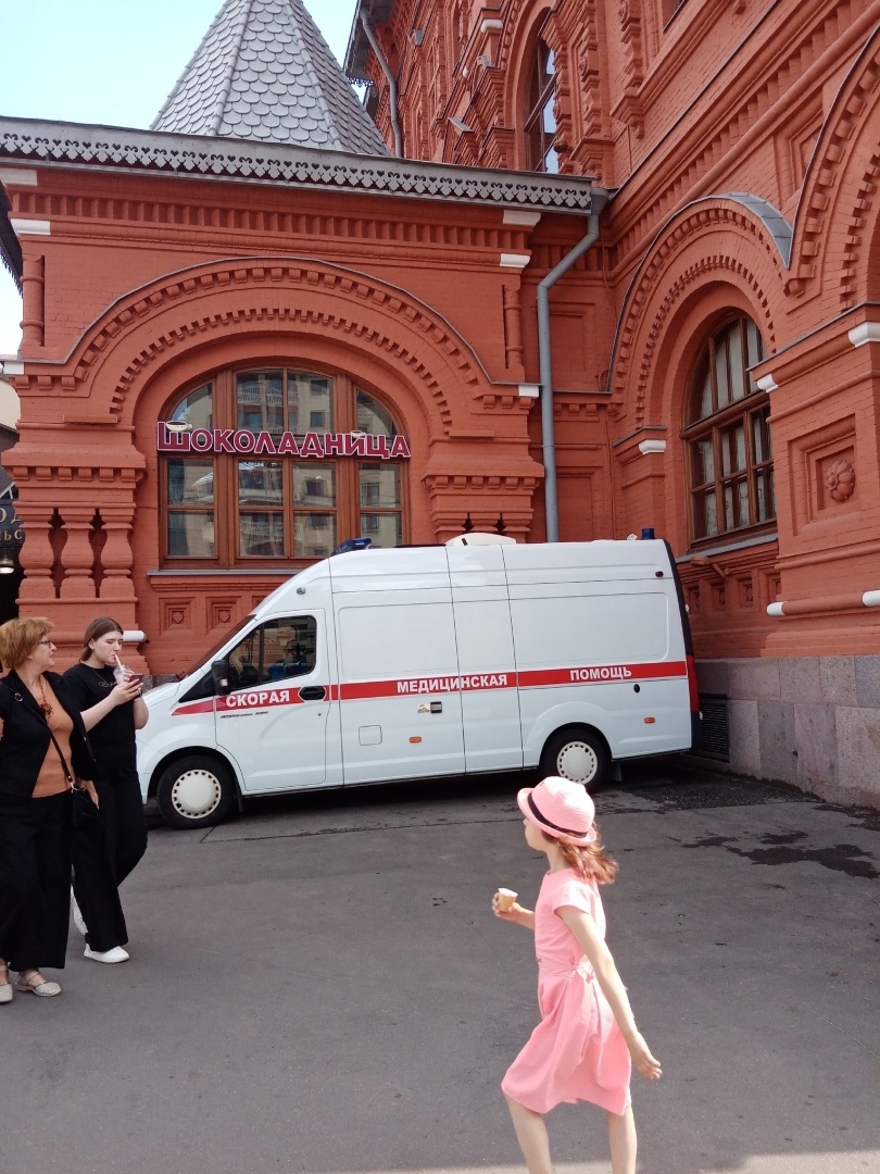 На Красной площади очень много жителей и гостей столицы. Для безопасности стоит "скорая помощь", прямо возле кафе "Шоколадница".