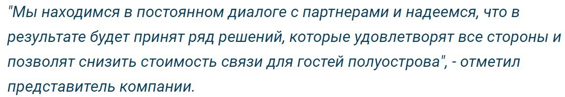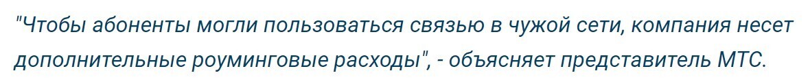 Но давайте попробуем разобраться, почему же операторы связи пошли на такой шаг. МТС, например, утверждает, что у них нет собственной сети в Крыму, и они вынуждены пользоваться услугами местных операторов.