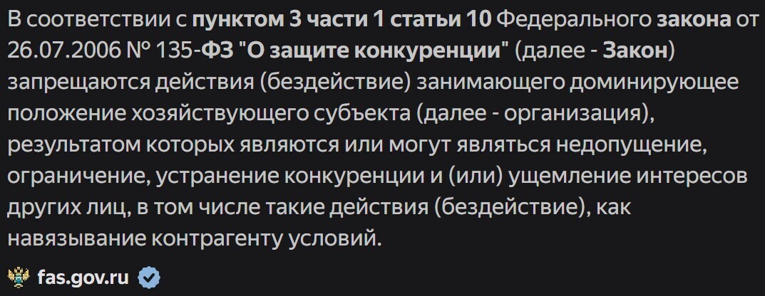 ФАС выдала предупреждения операторам связи на основании пункта 3 части 1 статьи 10 закона "О защите конкуренции". Этот пункт говорит о том, что использование хозяйствующим субъектом своего доминирующего положения на рынке для установления невыгодных условий договора может быть признано злоупотреблением.