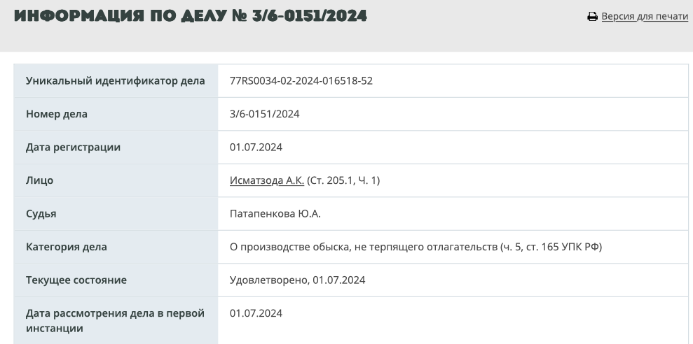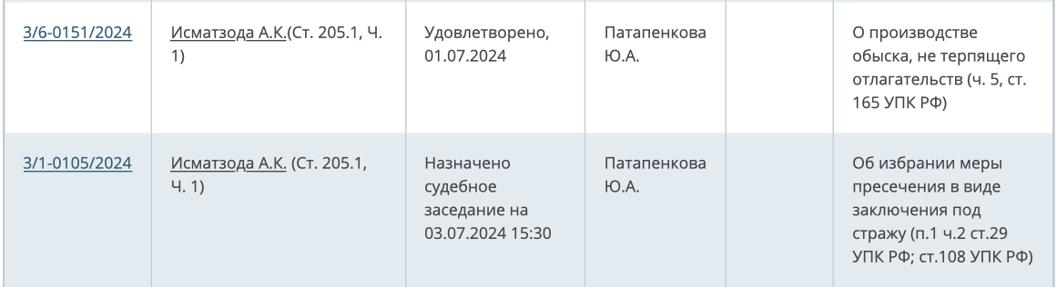 1 июля текущего года в Щербинский районный суд столицы России поступило и было зарегистрировано ходатайство о производстве обыска, не терпящего отлагательств (ч. 5, ст. 165 УПК РФ) в отношении тренера молодёжной сборной России по вольной борьбе Алишери Исматзоды. В этот же день постановлением федерального судьи Патапенковой Ю.А. данное ходатайство следствия удовлетворено.